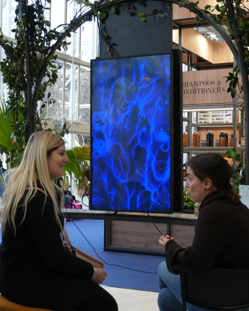 Lo stand di Rica Haircare è stato progettato nei minimi dettagli per creare un ambiente sensoriale avvolgente e coinvolgente. Nel dettaglio, l’installazione prevedeva due postazioni BrainArt e due monitor verticali, che trasmettevano in diretta le grafiche dinamiche modulate dalla mente dei partecipanti.